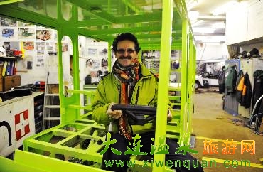 这张1月2日拍摄的照片显示,在位于瑞士阿尔卑斯山区的滑雪胜地采尔马特,最早开始在当地生产环保电动车的STIMBO电动车公司经理布鲁诺·英博登坐在即将完工的产品上。